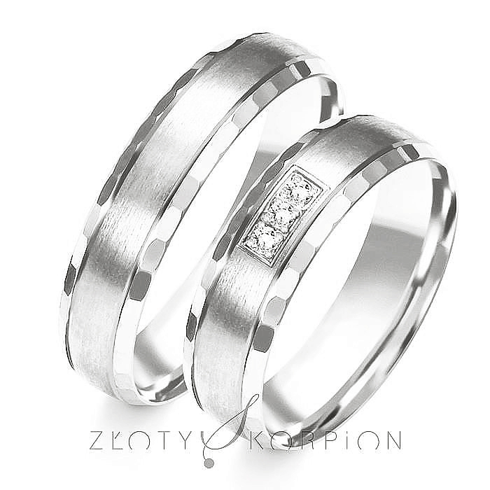 Obrączki złote o płaskim kształcie z ozdobnymi nacięciami na powierzchni o szerokości 5.0 mm w standardzie. Wysokość profilu (grubość) 1.2 mm jest dla tego modelu optymalna. Powierzchnia jest matowana a brzegi polerowane. Szerokość można zmieniać w zakresie: 4 - 8 mm a grubość (wysokości profilu): 1 - 1.5 mm. Komfort noszenia zapewnia wyoblenie od wewnątrz (soczewkowy kształt).  Na życzenie możemy wykonać obrączki ze szlachetnego białego złota palladowego. Taki stop nie zawiera niklu, co ma istotne znaczenie dla alergików. Niestety cena w tym przypadku jest nieco wyższa. Aby podnieść walory estetyczne można pokryć powierzchnię warstwą rodu - szlachetnego, śnieżno-białego metalu z grupy platynowców. Grawerunek jest bezpłatny. Wskazane jest, aby nie przekraczał 23 znaków. Dłuższe sentencje są słabo czytelne. Ten wzór wygląda równie interesująco w wersji z żółtego lub różowego złota.