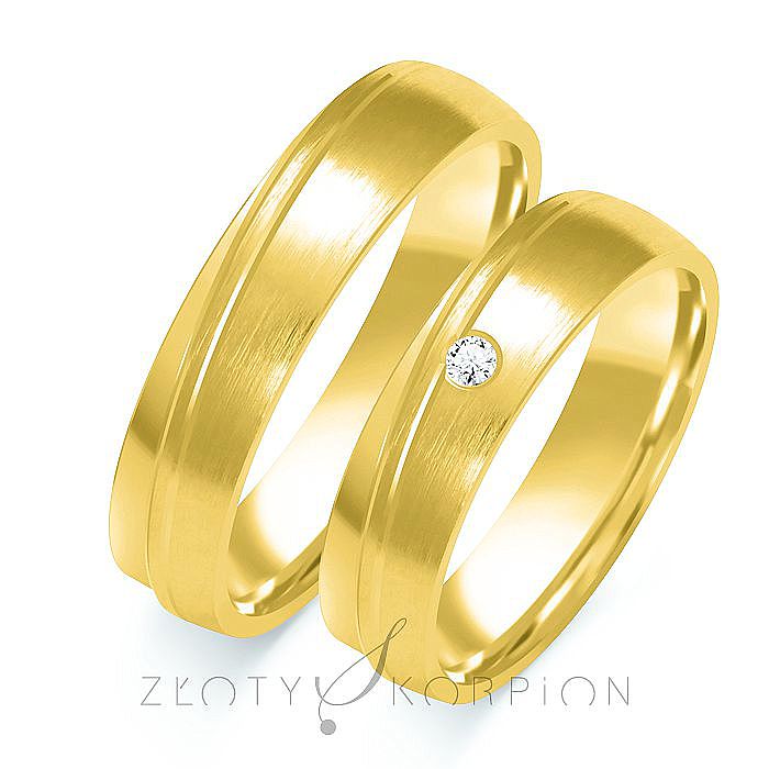 Obrączki złote o delikatnie wypukłym profilu, szerokości 5 mm i wysokości (grubości) 1.5 mm z ozdobnym nacięciem na obwodzie. Powierzchnia jest częściowa matowana a częściowo polerowana, co w tym wzorze wygląda bardzo korzystnie. Obrączkę damską ozdabia diament lub cyrkonia Svarowsky Sygnity. Producent proponuje pojedynczy brylant o średnicy 2 mm, masie 0.035 ct, czystości SI i kolorze H. Gratisowy grawerunek nie powinien przekraczać 23 znaków. Dłuższe sentencje są możliwe lecz słabo czytelne. Ten wzór wygląda równie pięknie wykonany z białego złota.