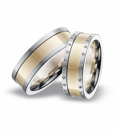 Ekskluzywne, masywne dwukolorowe obrączki o szerokości 7.6 mm z kolekcji Emotion firmy Breuning wzór 0141 wykonane w technologii bezszwowej. Na uwagę zasługuje intrygujący kształt . Dla modelu damskiego producent proponuje ciekawą oprawę brylantów o masie łącznej 0.132 ct H/Si. Powierzchnia może być matowana lub polerowana. Ten model można również wykonać z platyny lub palladu.