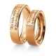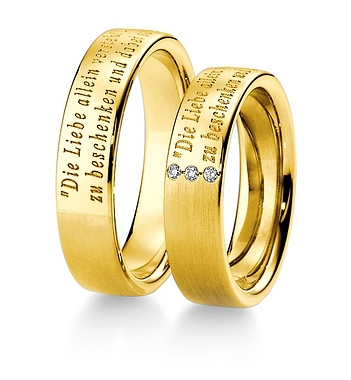 Ponadczasowe obrączki o klasycznym lekko wypukłym kształcie z ekskluzywnej kolekcji Premium firmy Breuning z żółtego lub różowego złota. Technologia bezszwowa zapewnia idealny kształt i niezwykłą wytrzymałość. Dzięki temu w przyszłości skorygować rozmiar bez obawy pęknięcia. W wersji przedstawione na zdjęciu połowa obrączki jest polerowana a druga matowana, ale oczywiście można to zmienić. Na zewnętrznej stronie producent proponuje grawerunek o dowolnej treści. Grawer jest wyryty dość głęboko i przez to dobrze widoczny i trwały. W modelu damskim producent proponuje oprawienie w poprzek pierścienia trzech brylantów o masie 0.01 ct każdy.