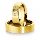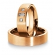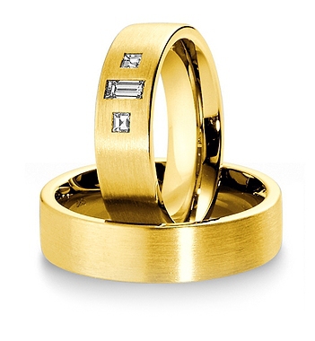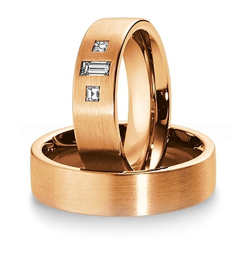 Ekskluzywne, dość masywne obrączki z żółtego lub różowego złota o szerokości 6 mm z kolekcji Premium firmy Breuning wzór 3150 wykonane w technologii bezszwowej. W przedstawionej na zdjęciu wersji zewnętrzna powierzchnia jest matowana. Na uwagę zasługuje interesująca oprawa trzech dużych brylantów o najwyższej czystości IF, barwie F, szlifie kwadratowym i prostokątnym o łącznej masie 0.26 ct. Ten model premium został zaprojektowany dla bardzo wymagających klientów ceniących obrączki nieco bardziej masywne z oprawą wartościowych diamentów.