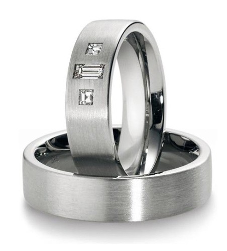 Ekskluzywne, dość masywne obrączki z białego złota o szerokości 6 mm z kolekcji Premium firmy Breuning wzór 3150 wykonane w technologii bezszwowej. w zaprezentowanej wersji powierzchnia jest matowana. Na uwagę zasługuje interesująca oprawa trzech dużych brylantów o szlifie kwadratowym i prostokątnym o najwyższej czystości IF i pięknej barwie F i łącznej masie 0.26 ct. Ten model został zaprojektowany z myślą o wymagających klientach ceniących obrączki dość masywne z pięknymi brylantami o najwyższych parametrach.
