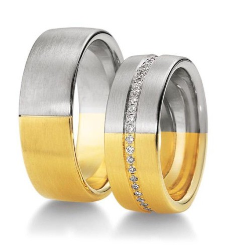 Obrączki dwukolorowe o szerokości 8 mm z kolekcji Premium firmy Breuning wzór 3240 wykonane w technologii bezszwowej. Obrączka jest wykonana w połowie z białego, a w połowie żółtego lub różowego złota. Powierzchnia może być matowana lub polerowana. W wersji matowej wygląda bardzo korzystnie. W modelu damskim producent proponuje oprawienie na całym obwodzie obrączki brylantów o łącznej masie 0.47 ct, barwie H i czystości Si. Masa brylantów może się zmienić w zależności od rozmiaru.