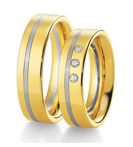 Obrączki dwukolorowe o szerokości 6 mm z kolekcji Premium firmy Breuning wzór 3320 wykonane w technologii bezszwowej. Obrączka jest wykonana z żółtego złota z delikatnym paseczkiem z białego złota umieszczonym niesymetrycznie po jednej stronie. W wersji zaprezentowanej na zdjęciu obrączka powierzchnia jest polerowana za wyjątkiem matowanego wąskiego pierścienia z białego złota. W modelu damskim producent proponuje oprawienie trzech brylantów o masie 0.03 ct każdy, barwie H i czystości Si. Oczywiście jest możliwość oprawienia większej ilości diamentów o innych parametrach.