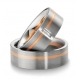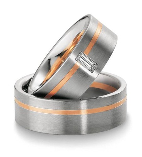Masywne obrączki z kolekcji Premium firmy Breuning o szerokości 8 mm z kolekcji Premium wykonane z dwóch kolorów złota w technologii bezszwowej. Model 3330 jest wykonany z białego złota z wąskim pierścieniem z różowego lub żółtego złota umieszczonym niesymetrycznie. Powierzchnia wygląda bardzo korzystnie w wersji matowanej, ale oczywiście jest dostępna również polerowana. Na uwagę zasługuje przepiękny ćwierćkaratowy brylant (0.25 ct) o szlifie prostokątnym, najwyższej możliwej czystości IF i pięknej barwie F.