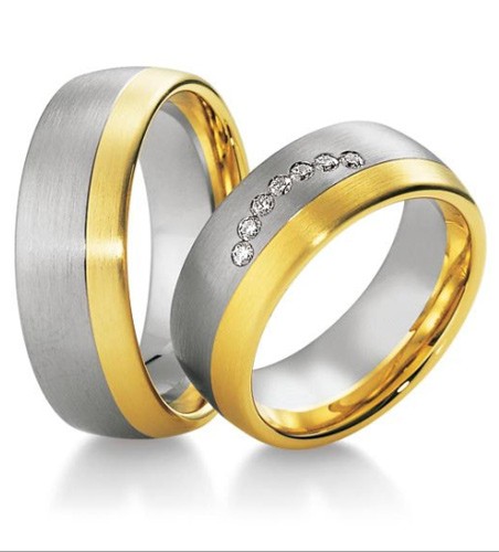 Ciekawa propozycja obrączek dwukolorowych o szerokości 8 mm o klasycznych półokrągłych kształtach i szerokości aż 8 mm. Model 3450 należy do ekskluzywnej kolekcji Premium firmy Breuning skierowanej do najbardziej wymagających klientów. Tak jak pozostałe również ten wzór wykonany jest w technologii bezszwowej zapewniającej idealny kształt i wysoką wytrzymałość i trwałość wyrobu. Obrączka jest wykonana z białego złota z węższym pierścieniem z różowego lub żółtego złota osadzonym po jednej stronie. Na zdjęciu przedstawiono wersję w całości matowaną. W modelu damskim producent proponuje ciekawą oprawę siedmiu brylantów o masie łącznej 0.14 ct, barwie H i czystości Si, co sprawia, że obrączka jest niezwykle oryginalna.