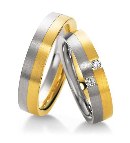 Obrączki dwukolorowe z kolekcji Premium firmy Breuning wzór 3520 dla najbardziej wymagających klientów. Ten model, tak jak pozostałe tego producenta, wykonany jest w oparciu o najnowocześniejszą technologię bezszwową. Obrączka o płaskiej powierzchni zewnętrznej i szerokości 5 mm składa się z dwóch jednakowych pierścieni z białego i żółtego złota połączonych ze sobą metodą sinteringu. W wersji standardowej producent proponuje matową powierzchnię i w takim wykonaniu ten model wygląda bardzo korzystnie. Oczywiście można zamówić ten wzór polerowany. W modelu damskim producent proponuje ciekawą oprawę dwóch brylantów - każdy o masie 0.05 ct barwie H i czystości Si.