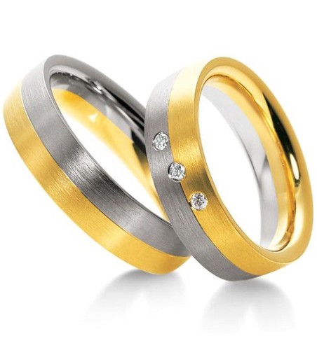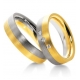 Obrączki z dwóch kolorów złota o szerokości 6 mm z kolekcji Premium firmy Breuning wzór 3520 wykonane w technologii bezszwowej. Obrączka składa się z dwóch pierścieni wykonanych z białego, żółtego lub różowego złota. Producent proponuje wersję z powierzchnią w całości matowaną, ale oczywiście dostępne są inne rozwiązania. Trzy brylanty o łącznej masie 0.075 ct H/Si są oprawione na skos. Wygląda to interesująco, ale klient może zdecydować o inne oprawie diamentów.