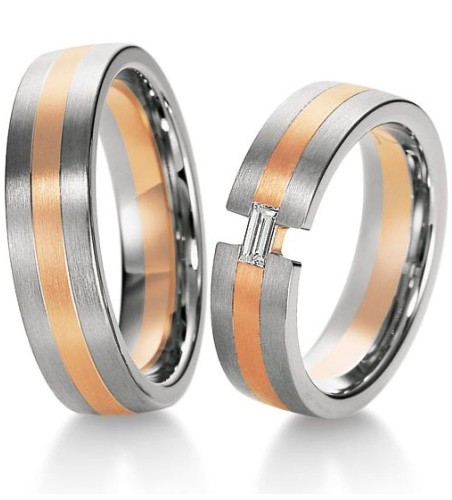 Obrączki z dwóch kolorów złota o szerokości 6 mm z kolekcji Premium firmy Breuning wzór 3640 wykonane w technologii bezszwowej. Obrączka wykonana jest z białego złota z pierścieniem z różowego lub żółtego złota przez środek. Powierzchnia może być matowana lub polerowana. W modelu damskim producent proponuje oprawienie najwyższej klasy brylantu o czystości IF i masie 0.14 ct H/Si.