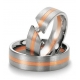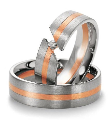 Ciekawy model obrączek z dwóch kolorów złota o szerokości 6.5 mm z kolekcji Premium firmy Breuning. Jak wszystkie pozostałe wzór 4003 wykonany jest w technologii bezszwowej. Składa się z trzech pierścieni z różnych kolorów złota połączonych ze sobą metodą sinteringu, czyli spiekania w wysokich temperaturach. Spoina w takiej metodzie jest zupełnie niewidoczna a jej wytrzymałość taka sama jak litego materiału. Na uwagę zasługuje oryginalna oprawa brylantu w skośnym nacięciu. Diament ma masę 0,05 ct, barwę H i czystość SI. Wbrew pozorom mocowanie kamienia jest bardzo solidne i nie ma żadnej obawy, że diament się wykruszy. W standardzie producent proponuje zmatowanie całej powierzchni obrączki, ale można to zmienić.