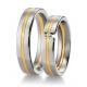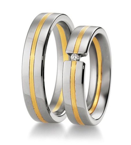 Obrączki dwukolorowe o szerokości 5 mm z kolekcji Premium firmy Breuning wykonane w technologii bezszwowej. Trzy pierścienie z różnych kolorów złota połączone są ze sobą metodą sinteringu, czyli spiekania w wysokich temperaturach. Spoina w takiej metodzie jest zupełnie niewidoczna a jej wytrzymałość taka sama jak litego materiału. Na uwagę zasługuje oryginalna oprawa brylantu o masie 0,03 ct, barwie H i czystości SI. Wbrew pozorom mocowanie kamienia jest bardzo solidne i nie ma żadnej obawy, że diament się wykruszy. Wersja standardowa jest wypolerowana za wyjątkiem pierścienia z żółtego lub różowego złota na środku, który jest matowany ale na żywczenie można to zmienić.