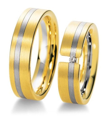 Ciekawy model obrączek z dwóch kolorów złota o szerokości 6 mm z kolekcji Premium firmy Breuning. Jak wszystkie pozostałe wzór 4009 wykonany jest w technologii bezszwowej. Składa się z trzech pierścieni różnej szerokości z różnych kolorów złota połączonych ze sobą metodą sinteringu, czyli spiekania w wysokich temperaturach. Spoina w takiej metodzie jest zupełnie niewidoczna a jej wytrzymałość taka sama jak litego materiału. Powierzchnia w wersji standardowej jest w całości matowana, co w tym modelu wygląda bardzo korzystnie. Na uwagę zasługuje oryginalna oprawa brylantu o masie 0,05 ct, barwie H i czystości SI. Wbrew pozorom mocowanie kamienia jest bardzo solidne i nie ma żadnej obawy, że diament się wykruszy.