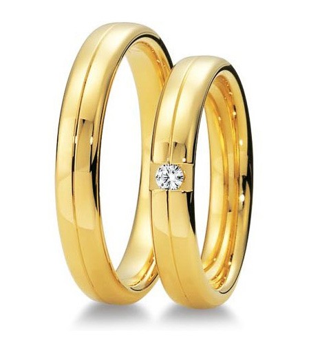 Proste klasyczne jednokolorowe obrączki Breuning wykonane z żółtego, białego lub różowego złota w technologii bezszwowej. W obrączce damskiej oprawiony brylant.