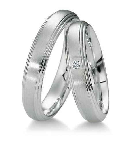 Proste klasyczne jednokolorowe obrączki Breuning wykonane z białego złota w technologii bezszwowej. W obrączce damskiej oprawiony brylant.