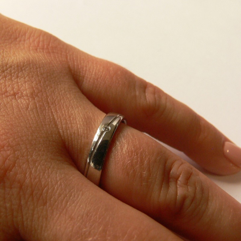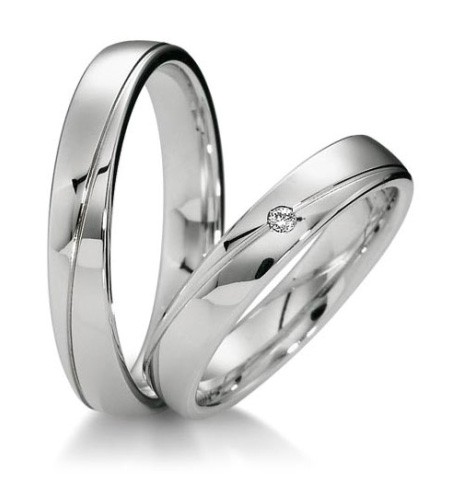 Proste klasyczne jednokolorowe obrączki Breuning wykonane z białego złota w technologii bezszwowej. W obrączce damskiej oprawiony brylant.