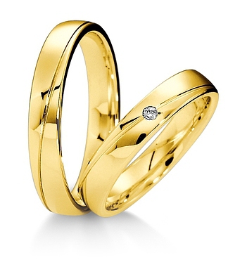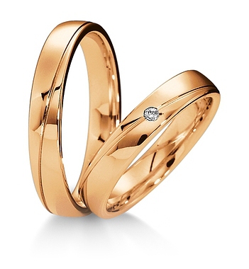 Proste klasyczne jednokolorowe obrączki Breuning wykonane z żółtego lub różowego złota w technologii bezszwowej. W obrączce damskiej oprawiony brylant.