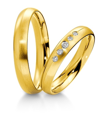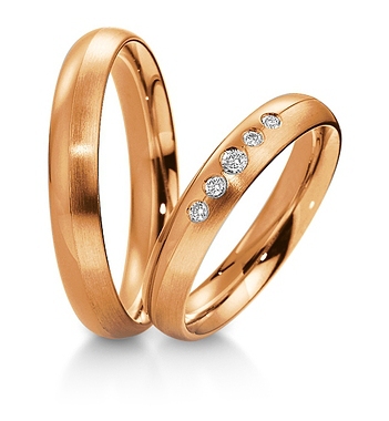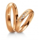 Proste klasyczne jednokolorowe obrączki Breuning wykonane z żółtego, białego lub różowego złota w technologii bezszwowej. W obrączce damskiej oprawiony brylant.