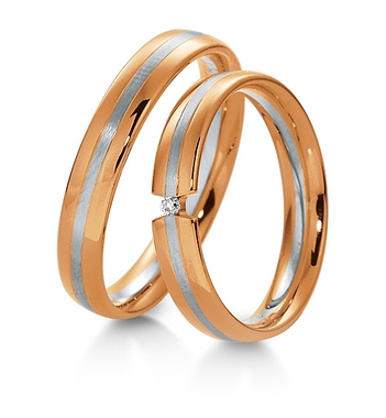 Dwukolorowe obrączki Breuning wykonane w technologii bezszwowej. W obrączce damskiej oprawiony brylant.