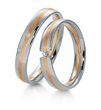 Dwukolorowe obrączki Breuning wykonane w technologii bezszwowej. W obrączce damskiej oprawiony brylant.