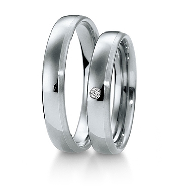 Obrączki ślubnych firmy Breuning z kolekcji Basic o klasycznym półokrągłym kształcie wykonane w technologii bezszwowej. Jest to jedna z wersji modelu 4071. W wersji standardowej szerokość wynosi 4 mm, powierzchnia jest częściowo matowana a częściowo polerowana, ale można w całośći obrączki wypolerować lub zmatować. Damska ozdobiona jest pojedynczym diamentem o masie 0.02 ct H/SI. Ilość, jakość i wielkość kamieni na życzenie klienta można zmienić.