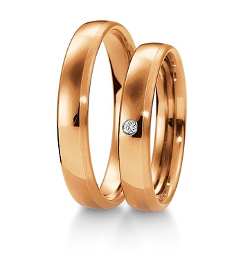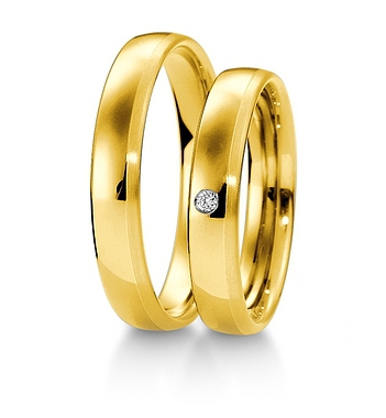 Obrączki ślubnych firmy Breuning z kolekcji Basic o klasycznym półokrągłym kształcie wykonane w technologii bezszwowej. Jest to jedna z wersji modelu 4071 wykonana z żółtego lub różowego złota. Ten sam model w wykonaniu z białego złota oraz dwukolorowy prezentujemy osobno. W wersji standardowej szerokość wynosi 4 mm, powierzchnia jest częściowo matowana a częściowo polerowana, ale można w całości obrączki wypolerować lub zmatować. Damska ozdobiona jest pojedynczym diamentem o masie 0.02 ct H/SI. Ilość, jakość i wielkość kamieni na życzenie klienta można zmienić.