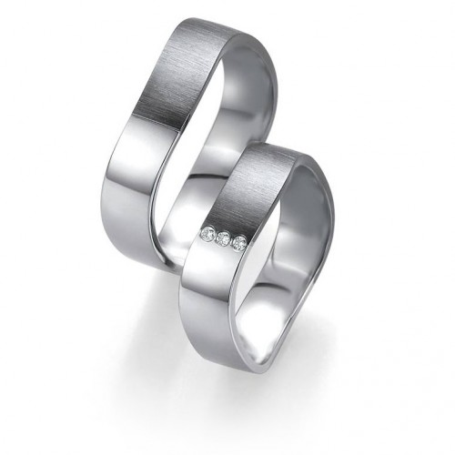 Obrączki MOONLIGHT wzór 7159 wykonane są z białego i czarnego złota w technologii bezszwowej. Firma Breuning stworzyła kolekcję Moonlight w odpowiedzi na duże zainteresowanie kolekcją Black & White, jednak zaprezentowane tu modele są delikatniejsze i subtelniejsze w formie i nieco tańsze. W zaprezentowanym wzorze powierzchnia z białego złota jest polerowana a z czarnego złota - matowana. Niezwykle oryginalny model o ciekawym kształcie. W obrączce damskiej w wersji standardowej zaproponowano oprawę trzech brylantów o łącznej masie 0.03 ct, barwie H i czystości SI. Można oprawić inną ilość diamentów o innych parametrach.