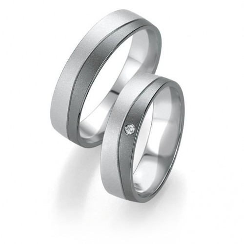 Obrączki MOONLIGHT wzór 7161 wykonane są z białego i czarnego złota w technologii bezszwowej. Firma Breuning stworzyła kolekcję Moonlight w odpowiedzi na duże zainteresowanie kolekcją Black & White, jednak zaprezentowane tu modele są delikatniejsze i subtelniejsze w formie i nieco tańsze. W zaprezentowanym wzorze powierzchnia z białego i czarnego złota jest matowana. W obrączce damskiej w wersji standardowej zaproponowano oprawę brylantu o masie 0.015 ct, barwie H i czystości SI. Można oprawić inną ilość diamentów o innych parametrach.