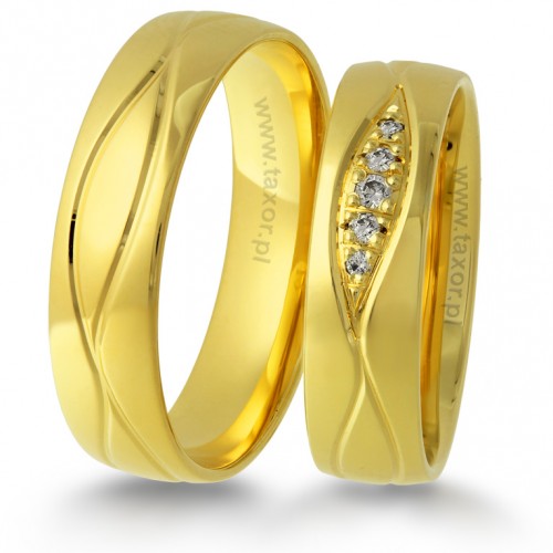 Złote obrączki o klasycznym półokrągłym kształcie i ciekawym zdobieniu w postaci falistych linii naciętych na obwodzie. Damska ozdobiona kamieniami: cyrkoniami lub diamentami.