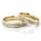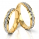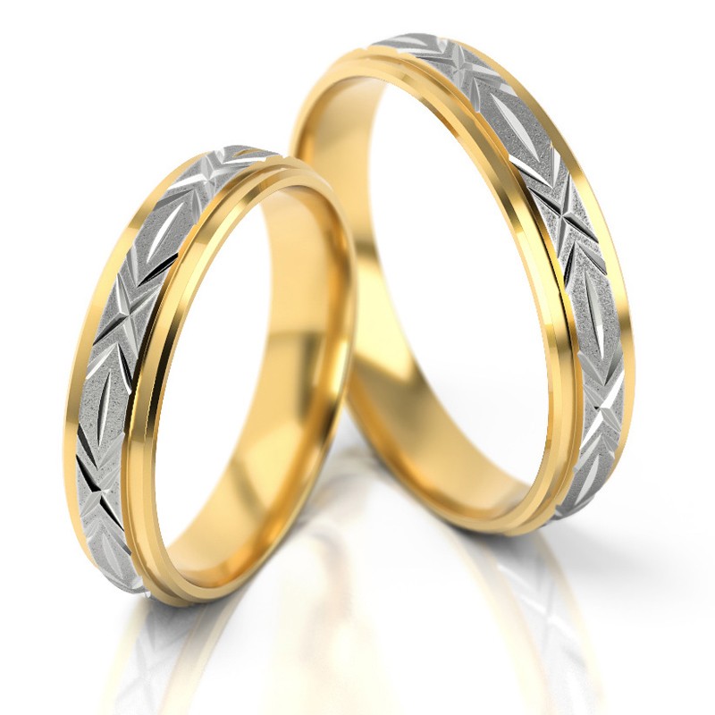 Dwukolorowe oryginalne obrączki wykonane ze złota w technologii bezszwowej. W przedstawionym wzorze żółte złoto jest polerowane a środkowy pierścień wykonany z białego złota ozdobiony nacięciami jest matowy (M2). W takim zestawieniu obrączka prezentuje się bardzo ciekawie.