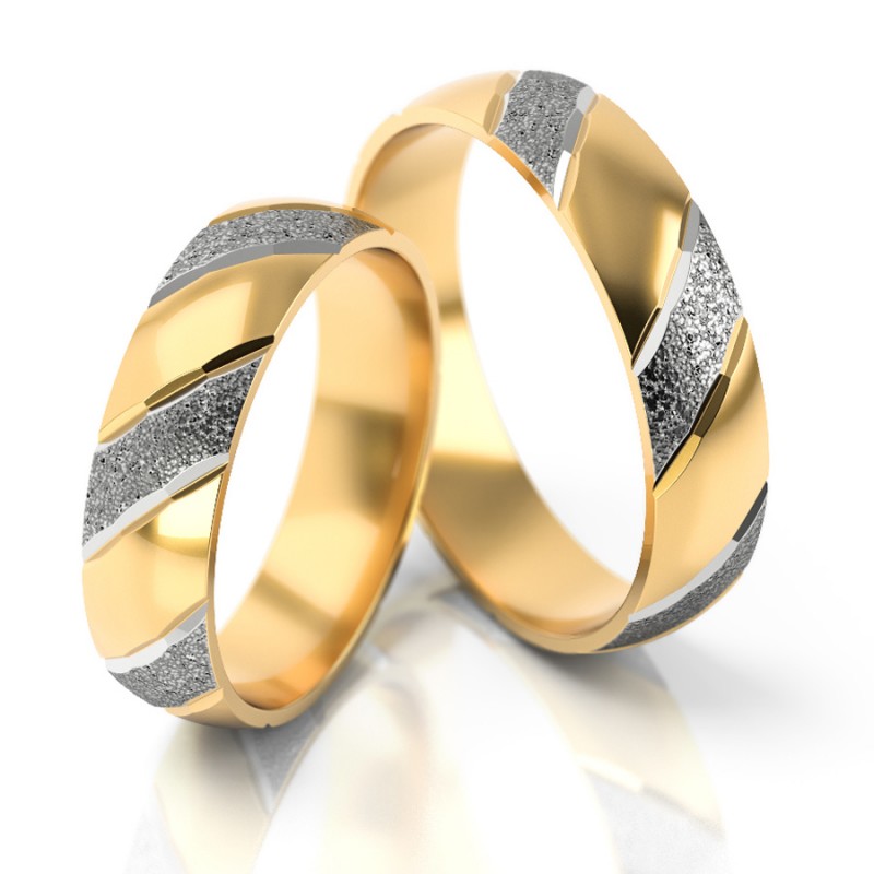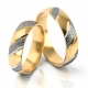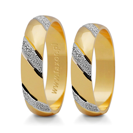 Dwukolorowa oryginalna obrączka wykonane ze złota w technologii bezszwowej. W przedstawionym wzorze żółte złoto jest polerowane, wstawki z białego złota są młotkowane, co nadaje obrączkom szczególny urok.