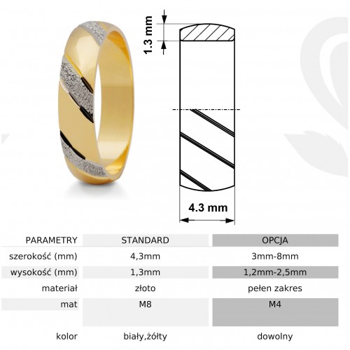 W wersji standardowej szerokość obrączek wynosi 4.3 mm, ale na życzenie klienta możemy ją zmienić w zakresie 3-8 mm - np. obrączka męska może być szersza od damskiej. Można również zmienić kolory złota i fakturę powierzchni. Istnieje też możliwość wykonania tego wzoru w wersji cięższej lub lżejszej zmieniając wysokość obrączki w zakresie od 1.2 do 2.5 mm. W przypadku chęci dokonania zmian w stosunku do wersji standardowej prosimy o kontakt przez przycisk "zadaj pytanie". Dokonamy wówczas indywidualnej wyceny zmodyfikowanego wzoru.