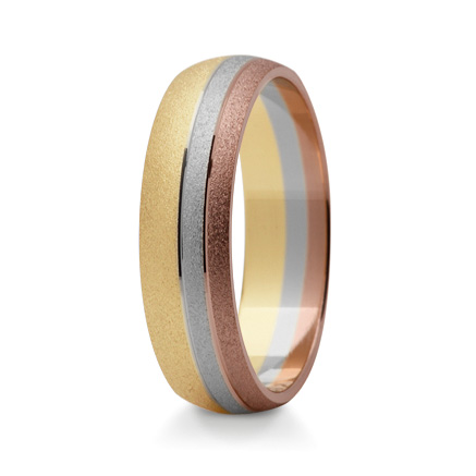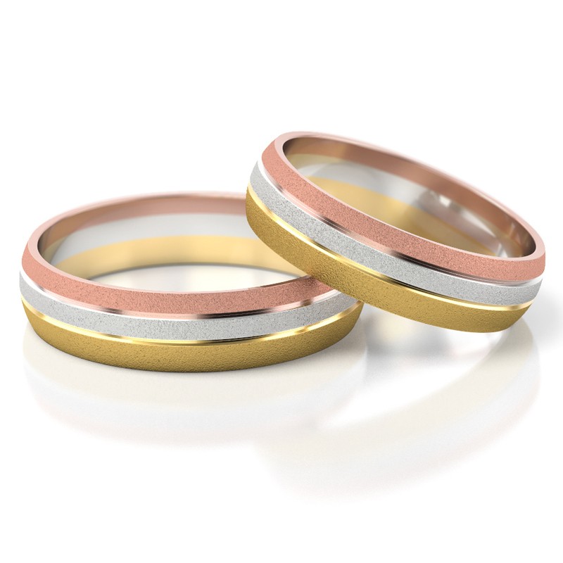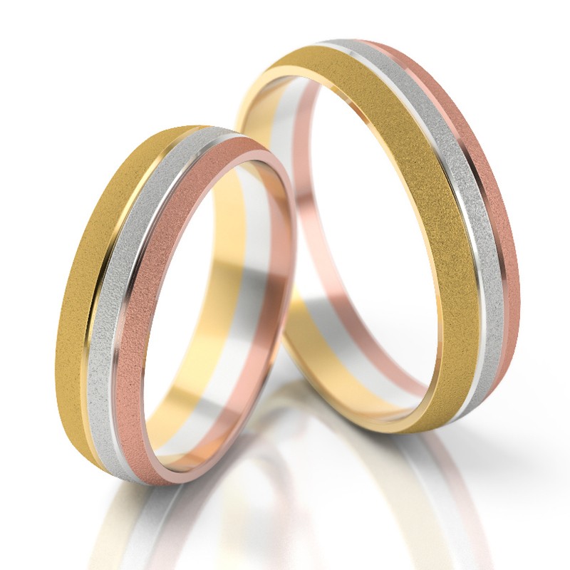 Trójkolorowa obrączka STELMACH wzór 32 o klasycznym półokrągłym kształcie wykonana w technologii bezszwowej. Obrączka składa się z trzech pierścieni z kolorowego złota.