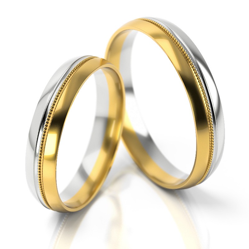 Dwukolorowe obrączki firmy Stelmach wzór 253 wykonane w technologii bezszwowej. Model ten o klasycznym kształcie składa się z dwóch pierścieni z różnych kolorów złota połączonych na środku. Miejsce łączenia jest ozdobione wzorkiem i dwoma wytoczonymi rowkami. W tym wzorze producent nie przewiduje oprawiania kamieni. Powierzchnia obrączek jest polerowana, ale na życzenie klienta można ją zmatowić na różne sposoby.