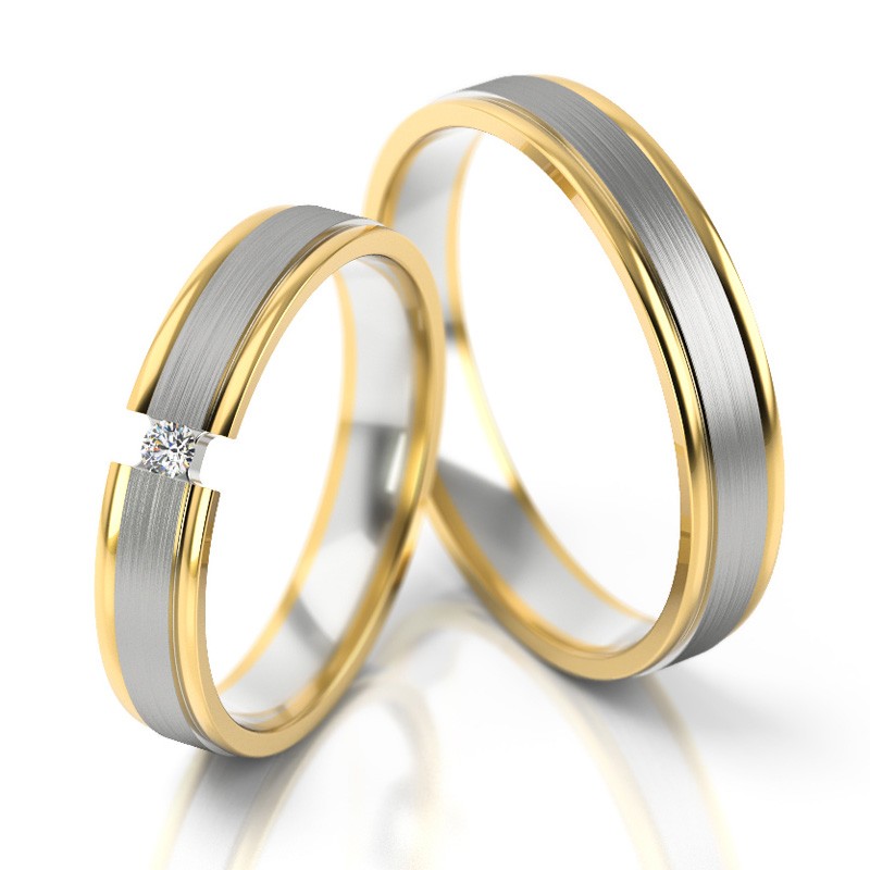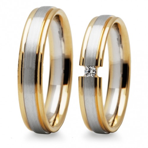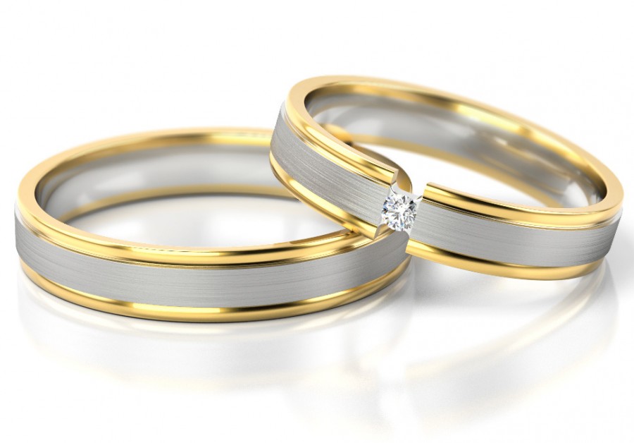 Obrączki Stelmach wzór 265 są wykonane z dwóch kolorów w technologii bezszwowej. Środkowy pierścień z białego złota niklowego lub palladowego jest zmatowany matem M3. Obrzeża są polerowane. Oprawa kamienia wbrew pozorom jest bardzo solidna