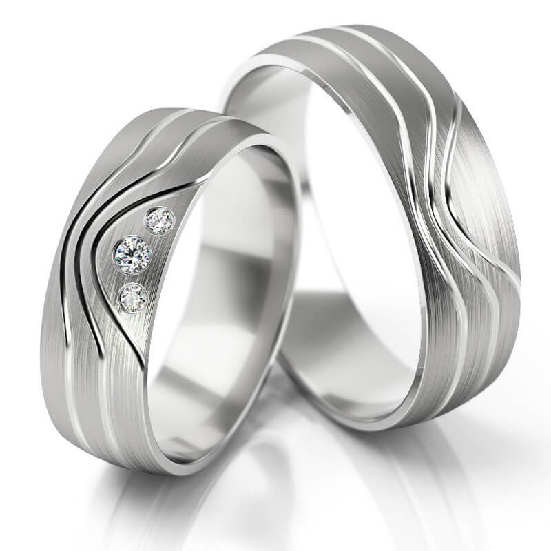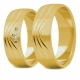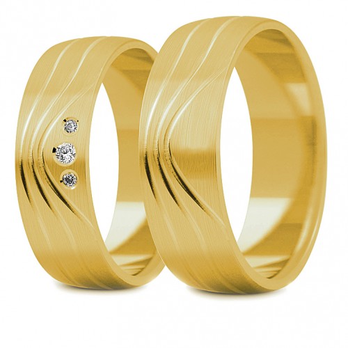 Niezwykle oryginalne obrączki ślubne produkcji  PZ Stelmach. Jest to jeden z piękniejszych wzorów z najnowszej kolekcji z bardzo ciekawym zdobieniem za pomocą naciętych niesymetrycznie rowków na zewnętrznej powierzchni obrączki. W obrączce damskiej dopełnieniem zdobień są pięknie oprawione trzy cyrkonie o średnicy 1.7 mm i 1.2 mm.