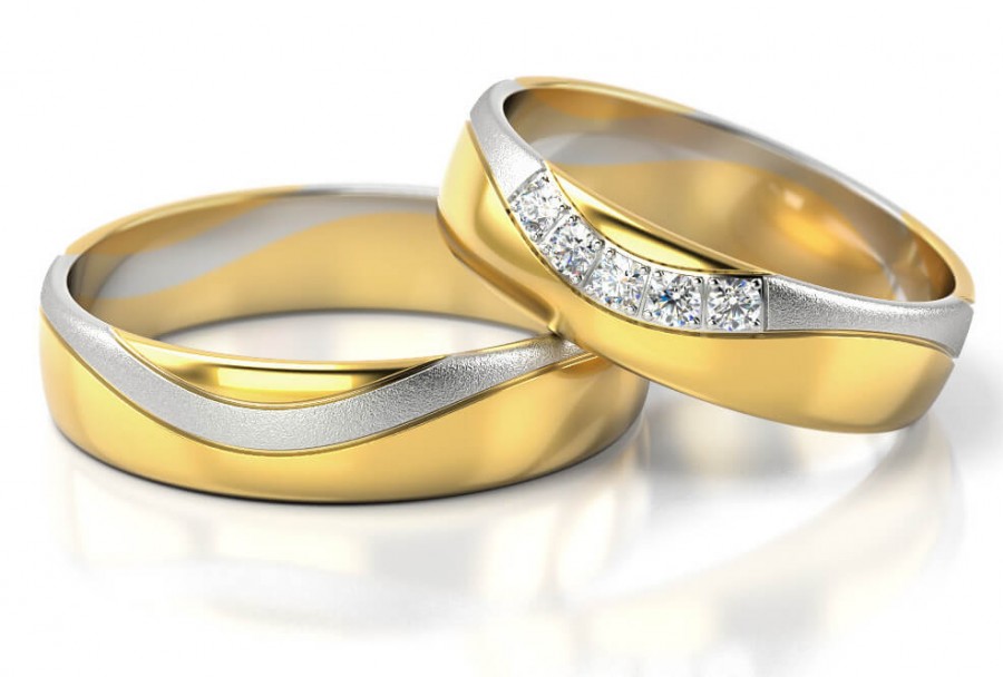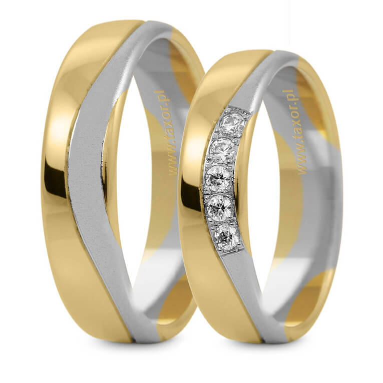 Przepiękne dwukolorowe obrączki ślubne z najnowszej kolekcji  PZ Stelmach. Dwa kolory złota przenikające się wzdłuż falistej linii tworzą niepowtarzalną kompozycję. Dla zwiększenia kontrastu część wykonana z białego złota jest matowana a żółta polerowana. Obrączkę damską producent ozdobił dodatkowo pięcioma kamieniami wkomponowując cyrkonie lub brylanty w białe złoto.