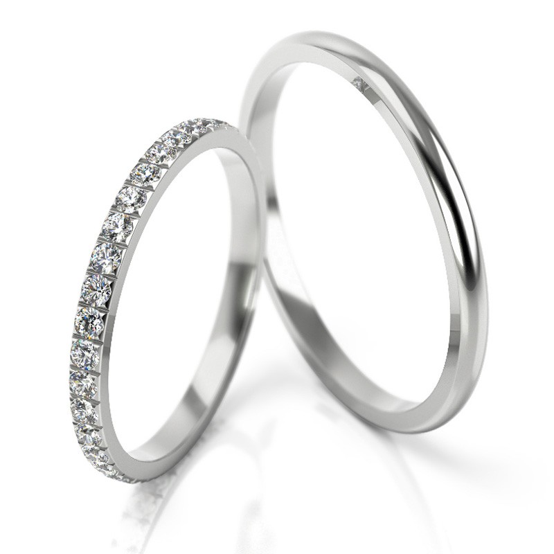 Para delikatnych obrączek o szerokości 1.8 mm z nowej kolekcji  PZ Stelmach, w których damska jest ozdobiona jest cyrkoniami lub brylantami na całym obwodzie.