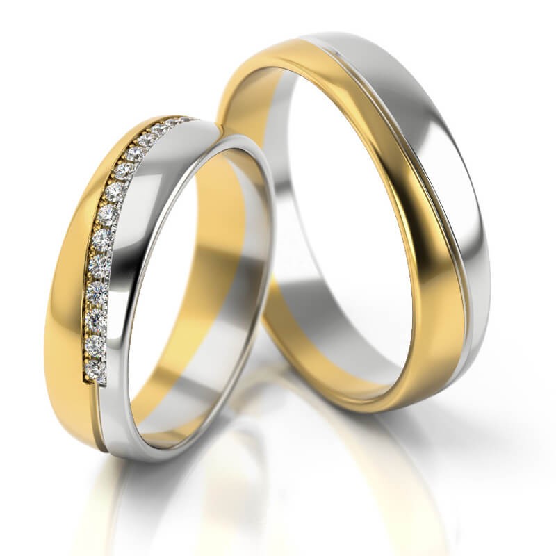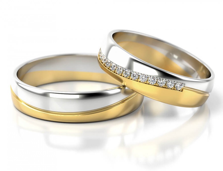 Dwukolorowe obrączki - wzór 308 z nowej kolekcji PZ Stelmach. Obrączka wykonana jest z żółtego i białego złota. Na całym obwodzie nacięty jest wzdłuż śrubowej linii ozdobny rowek oddzielający dwa kolory złota. Powierzchnia polerowana. W modelu damskim proponujemy oprawę 23 szt cyrkonii Swarovski Sygnity lub brylantów o łącznej masie 0.23 ct. Taki sposób oprawy jest bardzo bezpieczny i kamienie nie są narażone na wykruszenie.