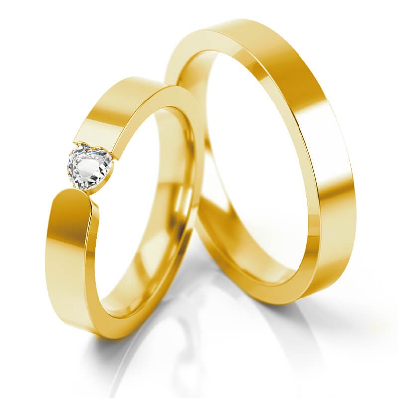 Piękny ponadczasowy wzór obrączek klasycznych z żółtego złota o szerokości 3.2 mm z interesującą oprawą cyrkonii w kształcie serca.