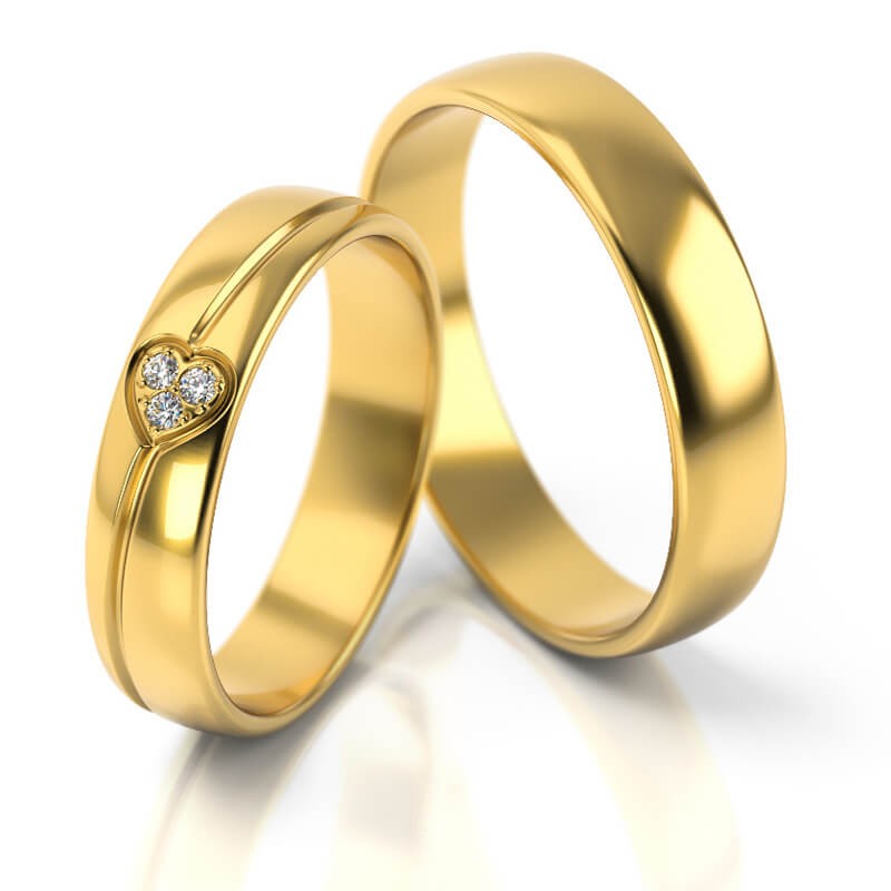 Piękne obrączki z żółtego złota z nowej kolekcji PZ Stelmach. Ponadczasowe, o klasycznym półokrągłym profilu są często wybierane przez naszych klientów. Damską ozdabiają kamienie oprawione w kształt serca.