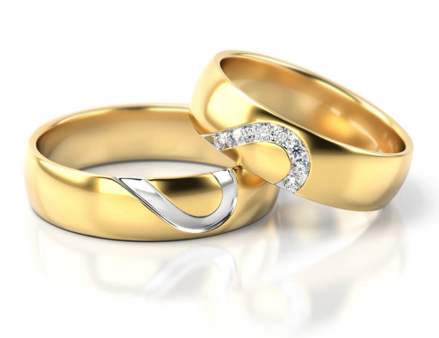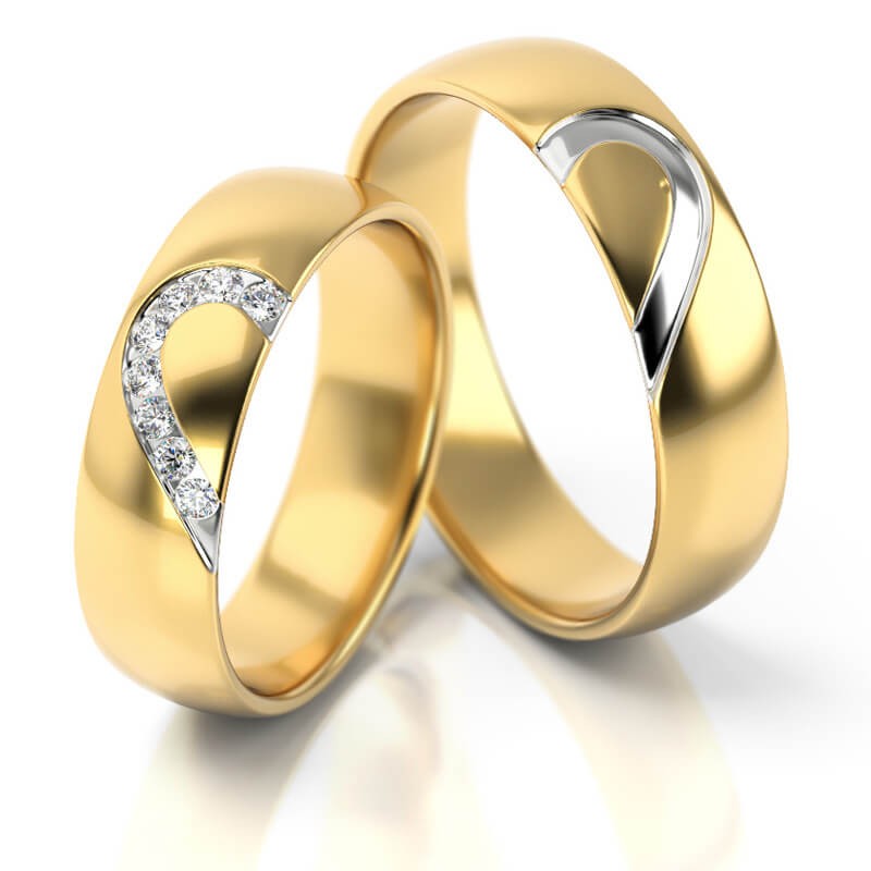 Bardzo oryginalny wzór z naciętym na powierzchni motywem serca. W damskiej w rowku osadzono 8 kamieni - cyrkonii lub brylantów o średnicy 1.2 mm każdy. Wnętrze rowka pokryte jest galwanicznie rodem. Nowoczesna technologia bezszwowa zapewnia obrączkom idealnie okrągły kształt, wysoką jakość i wytrzymałość. W standardzie szerokość wynosi 5 mm a wysokość profilu (grubość) 1.3 mm. Przy takich wymiarach ten wzór wygląda naszym zdaniem najkorzystniej, ale można zamówić wersję bardziej masywną o szerokości zwiększonej do 6 mm i wysokości profilu 1.6 mm. Do produkcji biżuterii firma Stelmach używa najwyższej jakości stopów żółtego złota w próbie 333, 585 i 750. Sugerujemy wybranie próby 585 jako optymalnej dla tego rodzaju wyrobów jubilerskich. Wyoblenie (soczewka) znacznie zwiększa komfort noszenia i warto wybrać tę opcję. Taka obrączka jest wygodniejsza w użytkowaniu. Doskonale dopasowuje się do palca i zapobiega jego poceniu.