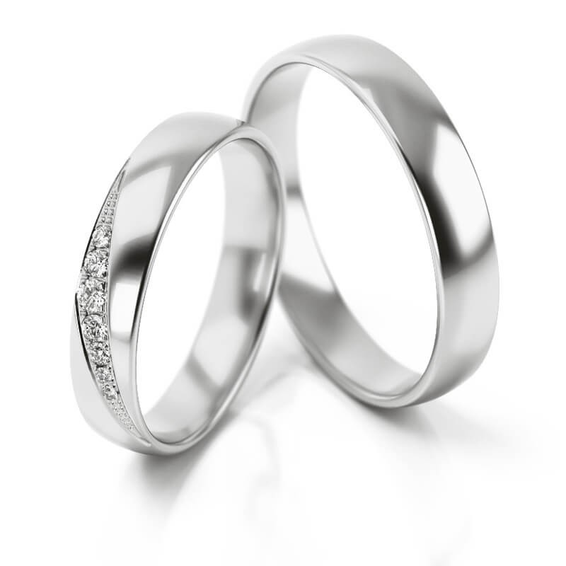 technologia bezszwowa stosowana przez firmę Stelmach, która należy do czołówki polskich producentów obrączek ślubnych. To jeden z często wybieranych wzorów. Na uwagę zasługuję piękna oprawa kamieni w modelu damskim. Można użyć brylantów H/SI lub cyrkonii Swarovski Sygnity. Standardowa wysokość profilu wynosi 1.25 mm. Na życzenie można ją zwiększyć do 1.5 mm. Zmiany szerokości producent nie przewiduje. Na zdjęciu zaprezentowano wzór z białego złota, ale dostępne są również w żółtym lub różowym złocie. Oferujemy ten wzór w trzech próbach złota - 333, 585 i 750. Optymalnym wyborem według nas jest stop złota próby 585 (14 karat). Białe złoto dostępne jest w dwu wariantach: tańsze niklowe i droższe, szlachetniejsze palladowe. Nikiel jest dość silnym alergenem i dla alergików zdecydowanie lepszym rozwiązaniem jest druga wersja. Warto wybrać opcję z