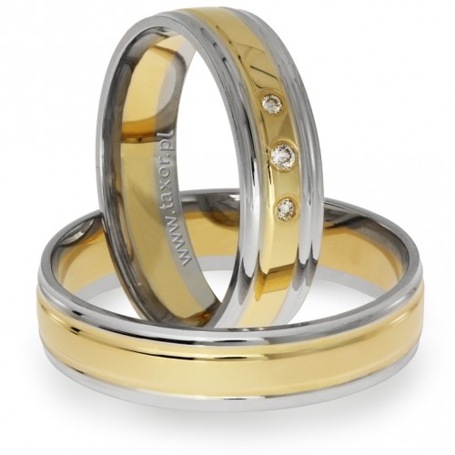 Ponadczasowy wzór obrączek z dwóch kolorów złota. Można wybrać złoto: żółte, różowe i białe w dowolnym zestawieniu. Standardowo obrączki mają szerokość  5 mm, ale na życzenie możemy ją zmienić. Można np. zamówić obrączkę węższą dla Pani, a szerszą dla Pana Młodego. Obrączka zaprezentowana jest w wersji polerowanej, ale nic nie stoi na przeszkodzie żeby zamówić matową. W tym modelu można oprawić do 9 sztuk kamieni. Obrączkę można zamówić w wersji komfortowej z soczewką (wyobleniem) od strony wewnętrznej. *