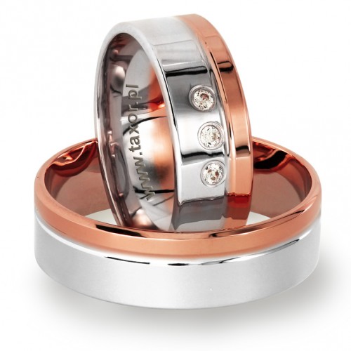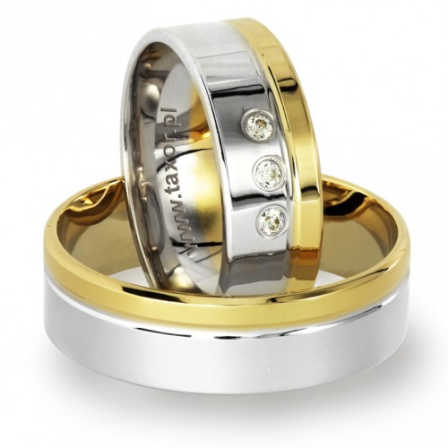 Klasyczne proste dwukolorowe obrączki z płaską polerowaną powierzchnią zewnętrzną. Niesymetryczne pierścienie w białego i żółtego złota nadają tym obrączkom szczególnego wyglądu. producent dopuszcza różne modyfikacje. Można wybrać złoto: żółte, różowe i białe w dowolnym zestawieniu. Standardowo obrączki mają szerokość 6 mm. W większości przypadków jest możliwość zmiany szerokości obrączek. Można np. zamówić obrączkę węższą dla Pani, a szerszą dla Pana Młodego. Obrączka zaprezentowana jest w wersji polerowanej, ale można zamówić matową. W damskiej obrączce można oprawić brylanty lub cyrkonie. *