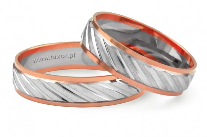 Dwukolorowe obrączki ślubne można wykonać z żółtego, różowego lub białego złota z dowolnym zestawieniu. Najkorzystniej wyglądają z pierścieniem wewnętrznym wykonanym z białego złota. Standardowo obrączki mają szerokość 5 mm, ale jest możliwość wykonania tego modelu w innych szerokościach. Obrączki zaprezentowane są w wersji z matowanym pierścieniem wewnętrznym. W zaprezentowanym wzorze nie przewidujemy oprawy kamieni. Na życzenie klienta każdą obrączkę można wykonać w wersji bardziej masywnej (pogrubionej).*
