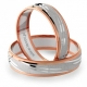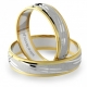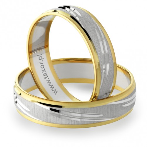 Oryginalne dwukolorowe obrączki z pierścieniem z białego złota na środku. Najkorzystniej ten model prezentuje się w wersji matowej z polerowanymi bardzo delikatnymi nacięciami na całym obwodzie. Producent dopuszcza różne modyfikacje. Można wybrać złoto: żółte, różowe i białe w dowolnym zestawieniu. Standardowo obrączki mają szerokość 5 mm. W większości przypadków jest możliwość zmiany szerokości obrączek. Można np. zamówić obrączkę węższą dla Pani, a szerszą dla Pana Młodego. Obrączka zaprezentowana jest w wersji matowanej, ale jest możliwość wykonania w wersji błyszczącej. W tym modelu nie przewidujemy oprawy kamieni. *