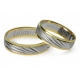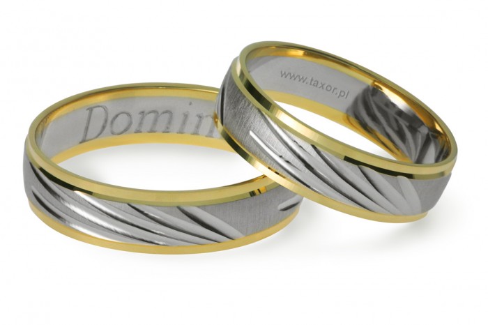 Dwukolorowe obrączki o szerokości 5 mm wykonane z białego i żółtego złota w technologii bezszwowej. Środkowy pierścień - matowy.  Na środkowym pierścieniu z białego złota nacięte są pod kątem ozdobne rowki, które nadają obrączkom niepowtarzalny charakter.