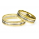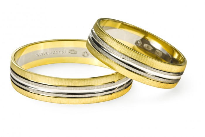 Eleganckie obrączki wykonane z białego i żółtego złota w technologii bezszwowej. Powierzchnia matowa z polerowanym rowkiem na środku i dwoma płytszymi rowkami oddzielającymi pierścienie o różnych kolorach złota.