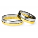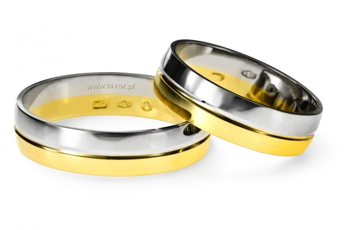 Dwukolorowe obrączki o szerokości 5 mm wykonane z białego i żółtego złota w technologii bezszwowej. Powierzchnia polerowana.  Półokrągły rowek oddziela pierścienie o różnych kolorach złota. Ten ponadczasowy bardzo elegancki wzór cieszy się ogromnym powodzeniem. W damskiej niesymetrycznie oprawione kamienie.