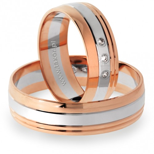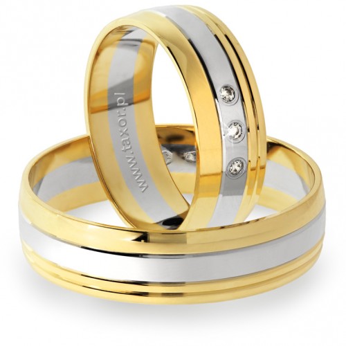 Klasyczna dwukolorowa obrączka, która od lat cieszy się dużym powodzeniem. Ten ponadczasowy wzór ma szerokość 6 mm, ale na życzenie możemy ją zmienić. Można np. zamówić dwie obrączki z tego modelu o różnej szerokości dla Pani i dla Pana Młodego. Na zdjęciu zaprezentowane są obrączki w wersji błyszczącej (polerowanej), ale dostępna jest również matowana. Damska obrączka może być ozdobiona cyrkoniami lub brylantami - do 9 szt. Obrączkę można zamówić w wersji komfortowej z soczewką (wyobleniem) od strony wewnętrznej. Można również, na życzenie klienta, wykonać ten model w wersji cięższej zwiększając wysokość (grubość) obrączki. *